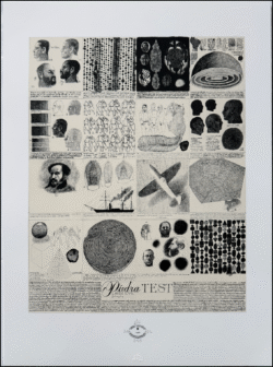 Through his micro lenses he uses to draw, he labeled each and every type of drawing material used to make each mark. Each texture and pattern, each figure, animal, portrait, each geometric form, each piece of text, he labeled and wrote what it was drawn with, just in case something didn’t work out. Then he would know which material he could use or not use for the real drawing. But in fact, all the materials worked out beautifully, so this documentation or inventory of drawing materials became “Piedra Test” (… even though a “piedra” or “stone” was not used. )